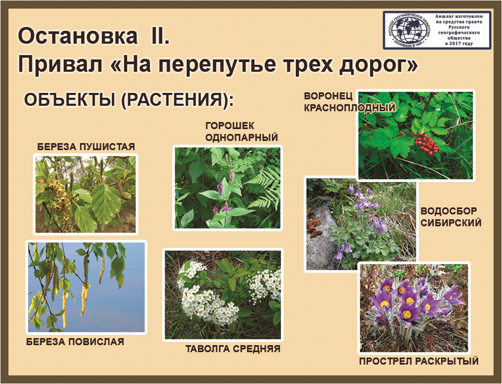 Следующая остановка – "На перепутье трех дорог". Здесь вы познакомитесь с растениями Усть-Кутского района, занесенными в Красную книгу, а также с редкими экземплярами нашей флоры.